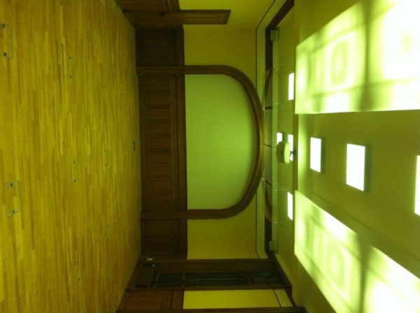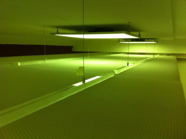 Traitement acoustique du plafond du restaurant en incorporant des encastrements acoustiques dans la dalle de béton.