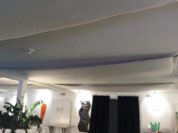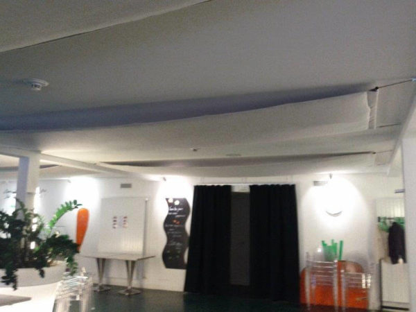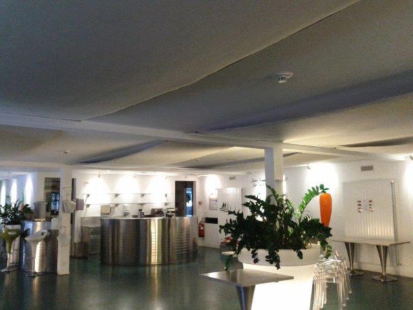 Traitement acoustique du plafond du restaurant en incorporant des encastrements acoustiques dans la dalle de béton.